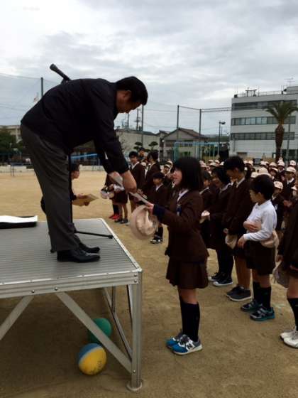 児童朝会で、賞状と盾を披露して伝達しました。大和田小学校の子どもたちは素晴らしいですね。