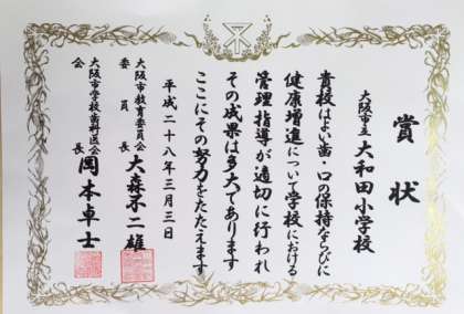 続いて、大和田小学校がよい歯・口の保持ならびに健康増進について、その成果に対して表彰を受けました。