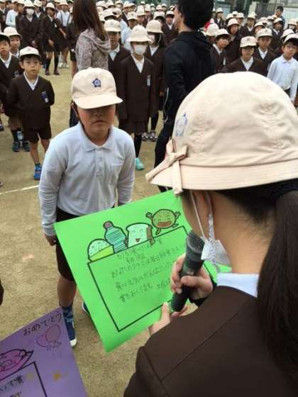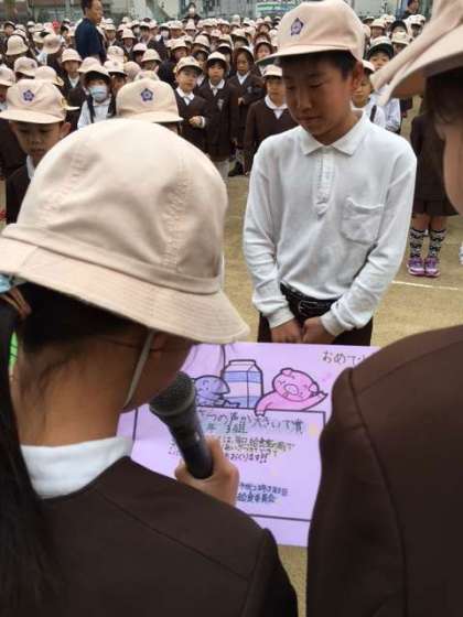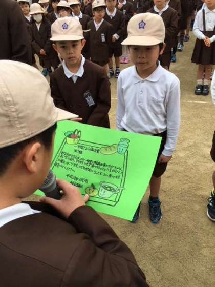 4年1組が「もりもり食べたで賞」、1年1組が「1年間でよく成長したで賞」、5年3組が「あいさつの声が大きいで賞」をいただきました。