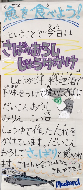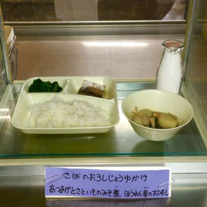今日の献立は、鯖のあろし醤油かけ、厚揚げと里芋の味噌煮、ほうれん草のおひたし、ごはん、牛乳です。