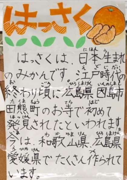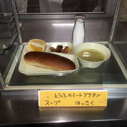 今日の献立は、豆腐のミートグラタン、スープ、黒糖パン、はっさく、牛乳です。いただきます!
