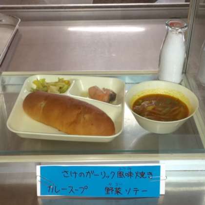 今日の献立は、サケのガーリック風味焼、野菜ソテー、カレースープ、レーズンパン、牛乳です。