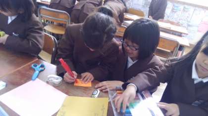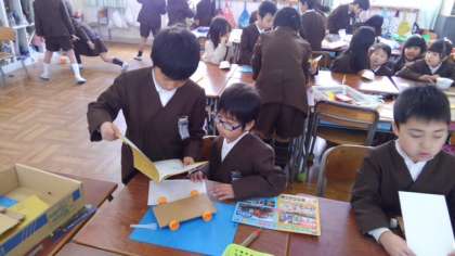 1年生2年生の交流です。今回、2年生は国語科『おもちゃ教室を開こう』の学習で、おもちゃ作りの説明書を書きました。そして、今日は1年生におもちゃ作りの説明をしています。わかりやすく、親切に教えている姿はとても頼もしいです。この1年間で、本当にしっかりした上級生になりました。
