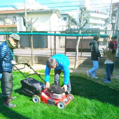 本日、午前10時より、グリーンコーディネーターの松崎さん、校庭芝生化委員会の山下さん、PTA会長の辻さん、子どもたちが芝生広場の更新作業をしてくださいました。