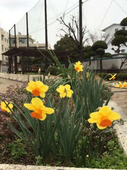子どもたちを、正門前で水仙の花が迎えてくれます。あと数週間すると、花盛りになりもっと賑やかになるでしょう。