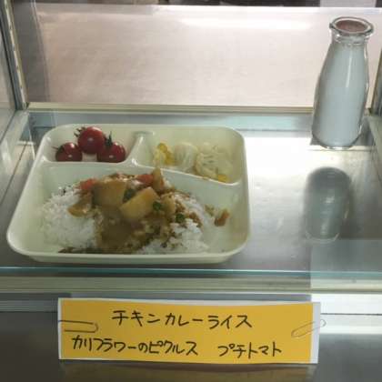 今日の献立は、チキンカレーライス、カリフラワーのピクルス、プチトマト、牛乳です。