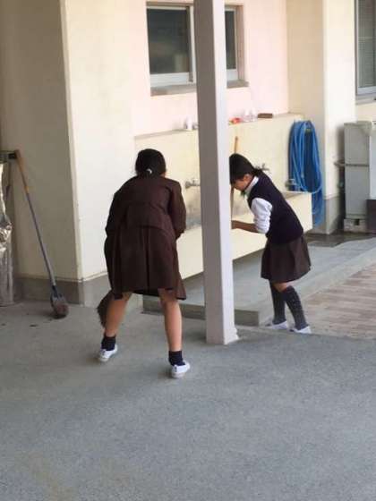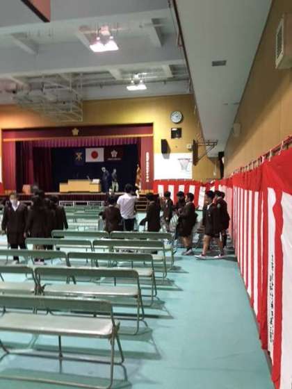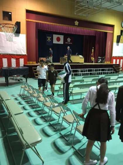 明日の卒業式を成功させるよう、5年生の児童に手伝ってもらい、会場設営と掃除をしてくれています。