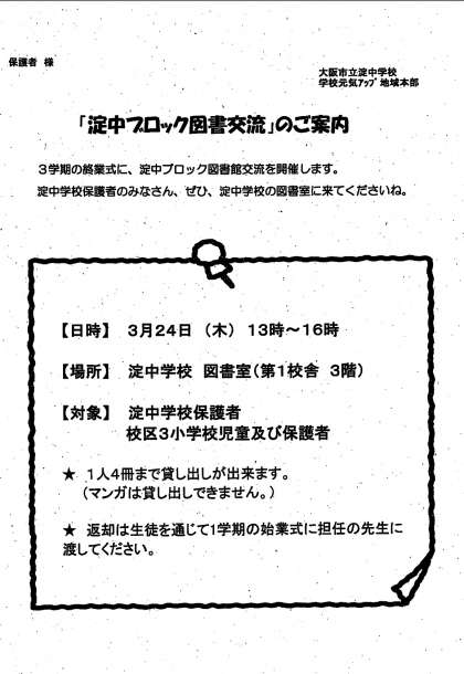明日、3月24日(木)淀中学校の図書室が淀中ブロックの学校に開放されます。
