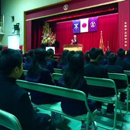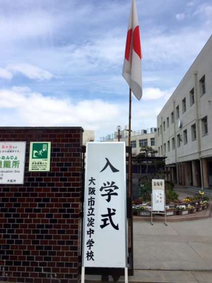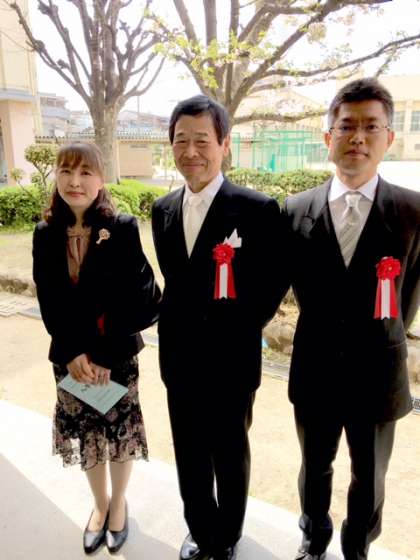 淀中学校の入学式に参列しました。辻PTA会長様、旧6年生担任の、大西先生、田中先生と一緒に新入生を祝福しました。