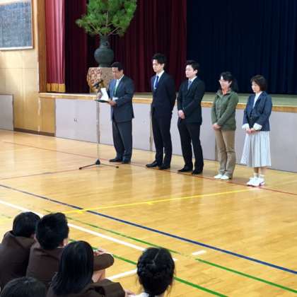 始業式に先立ち、転入児童の紹介と新転任の先生の紹介、転退職の先生の紹介を行いました。