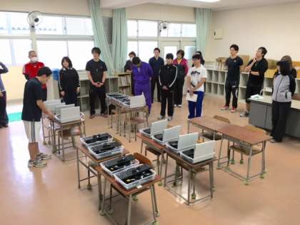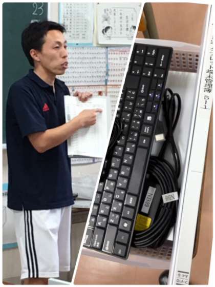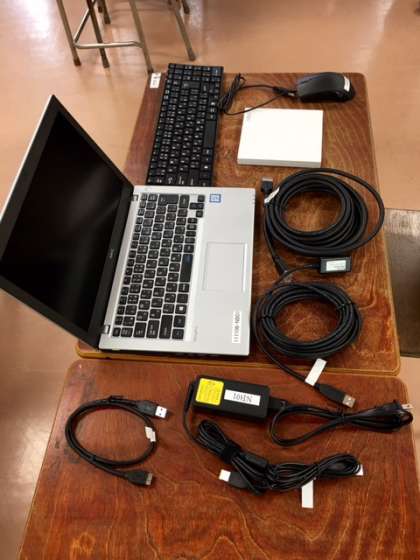 今日は始業式でしたが、大和田小学校の先生方はICT機器の研修をしています。新しいパソコンやタブレット、書画カメラに関連する機材について石倉先生から講習を受けて、各先生方に配付しました。