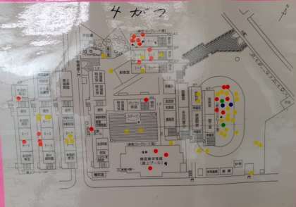 保健室の前に「廊下を走らないで」の掲示がありました。養護教諭の西嶋先生にうかがうと、昨年4月のケガを示したものだそうです。
