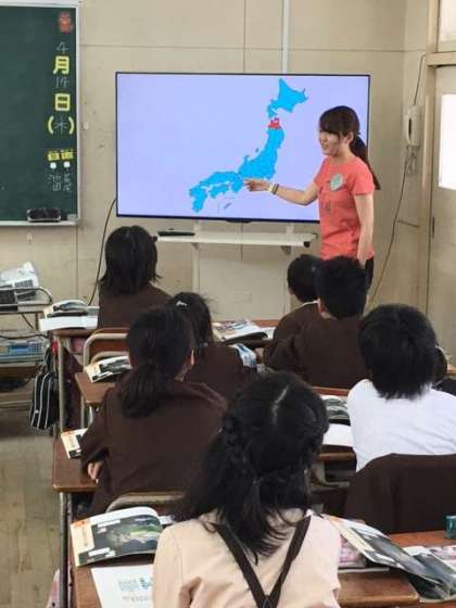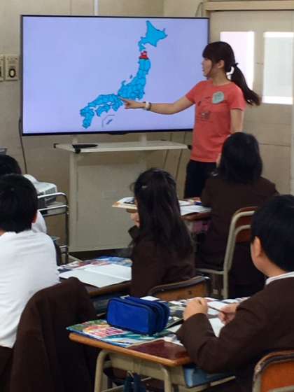 5年2組の社会です。担任の福間先生が、ICT機器(大型ディスプレイ)を使って指導しています。大きな画面に地図資料が写し出されるので、説明がよくわかります。