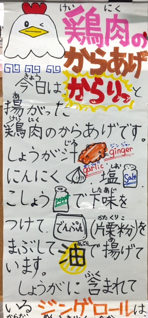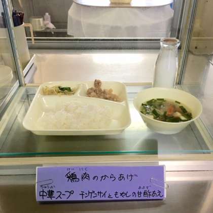 今日の献立は、鶏肉の唐揚、中華スープ、チンゲン菜とモヤシの甘酢和え、ごはん、牛乳です。