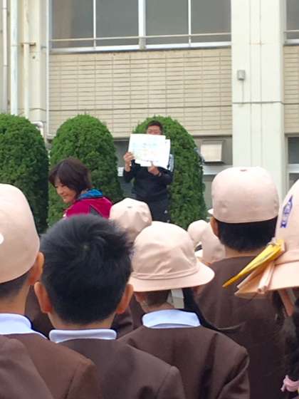 熊本地震の様子をもとに、大地震や津波が来た時の話をしました。地震が来たら自分の身体は自分で守る。机の下などに入リ揺れが収まるのを待つ。落ち着いて指示に従うこと。テレビ、ラジオ、防災無線など正しい情報を聞いて行動する。津波の情報を聞いたら、3階以上の高い建物に避難する。これらのお話がありました。