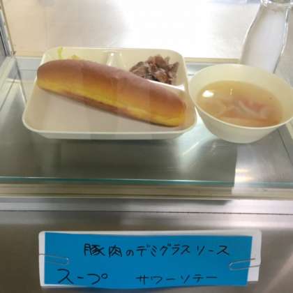 今日の献立は白米、豚肉のデミグラスソース、サワーソテー、スープ、パンプキンパン、牛乳です。