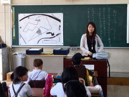 今日は、3年生が「校区探検」に出掛けます。教室で地図やメモ帳、タブレットを探検バッグに詰めています。