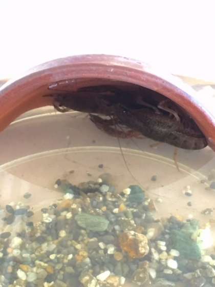 5年2組の廊下に、先日の遠足で釣ってきたザリガニが飼育されています。