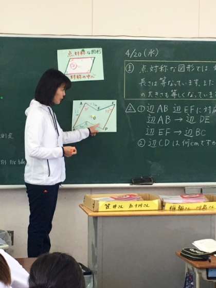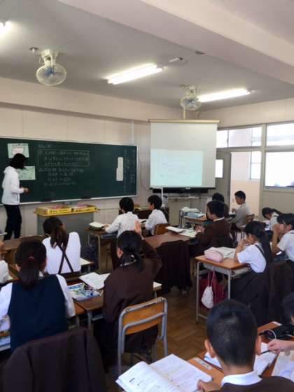 6年1組の越智先生の授業では、黒板だけでなく書画カメラやプロジェクターを使っています。