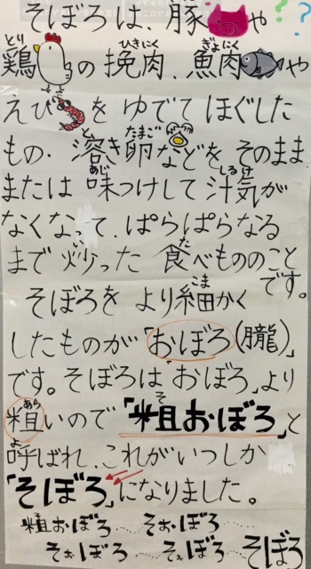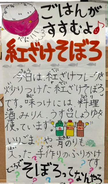 今日の献立は、焼き鳥、豚肉と厚揚の煮物、紅鮭そぼろ、ごはん、牛乳です。