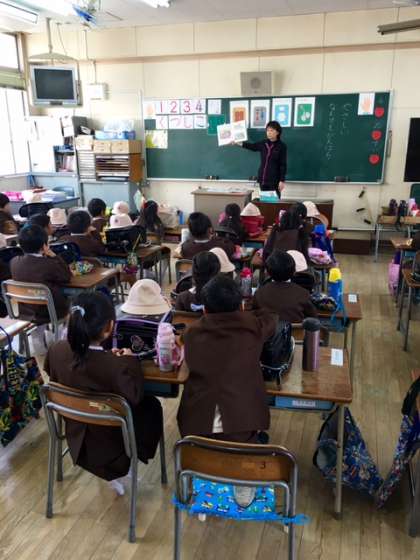 今日は、5時間目に「地区別子ども会」が行われます。それまでの時間を活用して1年1組では担任の下山先生が絵本の読み聞かせをしてくださっています。