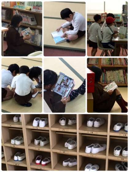 図書委員会の放送で子どもたちは図書室にたくさん集まり靴箱も、ほぼいっぱいです。