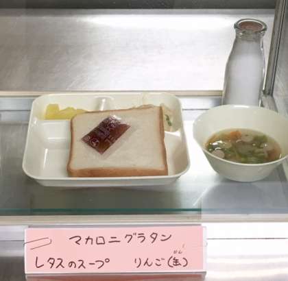 さて、今日の今夜は、マカロニグラタン、レタスのスープ、リンゴ(缶)、食パン、イチゴジャム、牛乳です。
