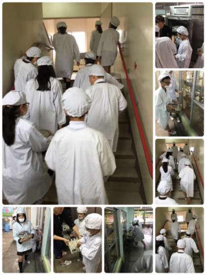 1年生の給食を運んでくれています。6年生ありがとうございます。