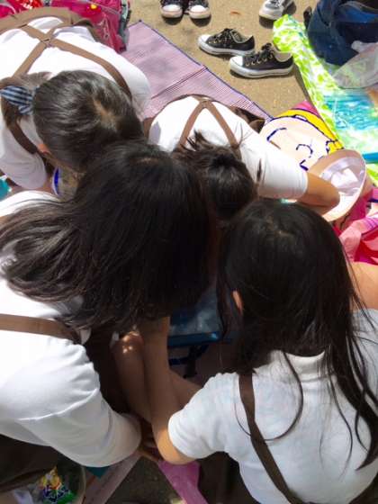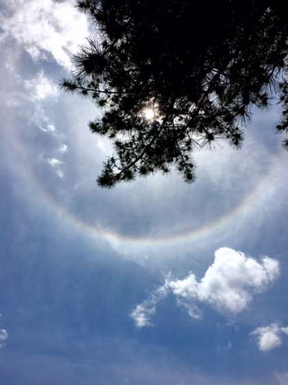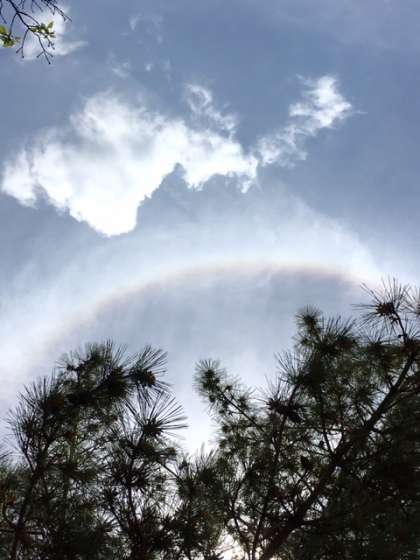 お弁当を食べていると、何と太陽の周りに虹が見えました。子どもたちはさっそくタブレットを取り出し撮影していました。