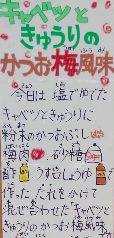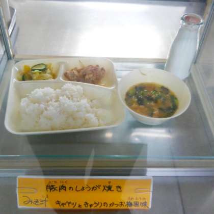 今日の献立は、豚肉の生姜焼き、キャベツとキュウリの鰹梅風味、味噌汁、ごはん、牛乳です。