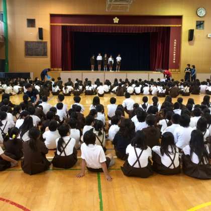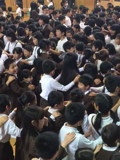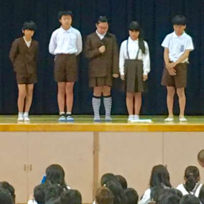 水曜日の朝は「なかよし集会」です。運営委員会の皆さんが今日は「なかよし列車」のゲームをしてくれました。