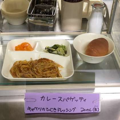 今日の献立は、カレースパゲッティ、キャベツのひじきドレッシング、黒糖ロールパン、みかん(缶)、牛乳です。