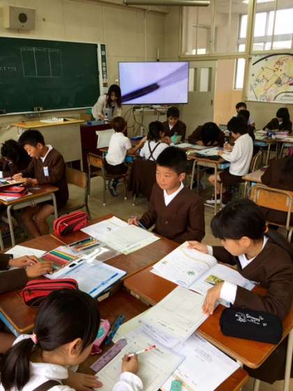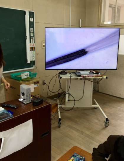 3年2組が理科の授業をしています。教室に入ると子どもたちが「校長先生、マリーゴールド」と種子を見せてくれました。担任の依田先生がテレビスコープ(電子顕微鏡)で、大きく映して見せてくださいました。