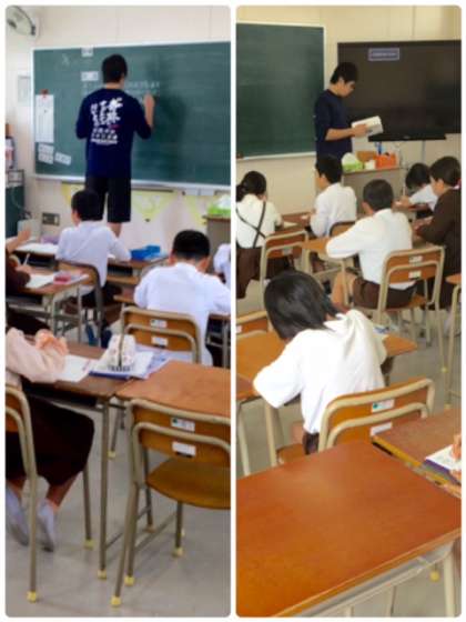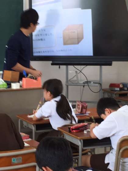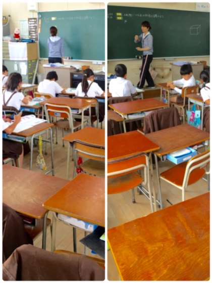 5年2組が算数を少人数授業で受けています。クラスを2分割して、きめ細やかな授業をしています。
