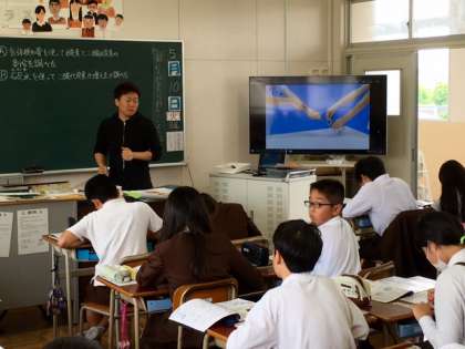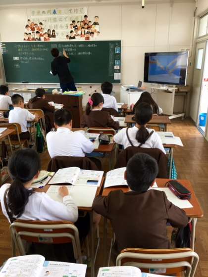 6年2組は理科の授業です。担任の坂田先生が大型ディスプレイを使ってわかりやすく指導しています。
