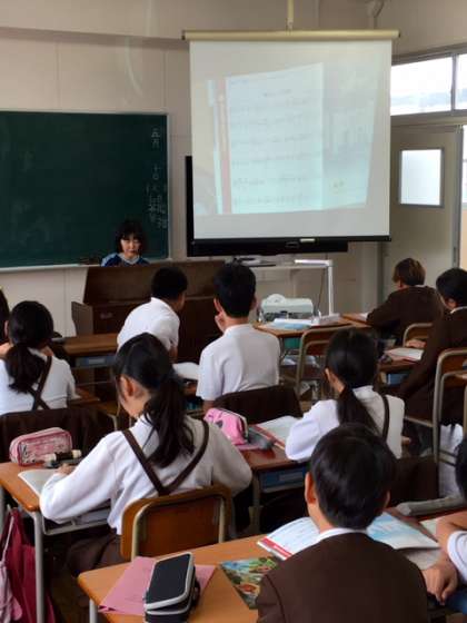 6年1組が音楽は音楽の授業です。越智先生がプロジェクターで楽譜を拡大して指導していました。