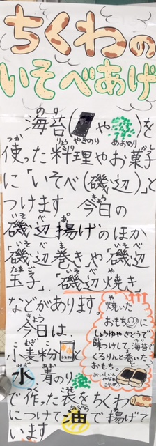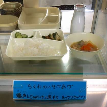 今日の献立は、竹輪の磯辺揚、鶏肉とじゃがいもの煮物、あっさりキュウリ、ごはん、牛乳です。