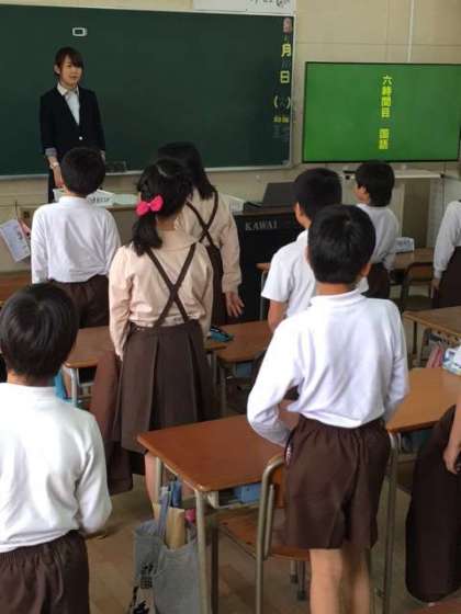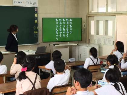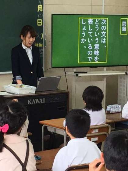授業の最初から、大型ディスプレイを使って、福間先生がクイズをはじめました。子どもたちは言葉の学習に引き込まれました。この1時間で、何を学ぶか楽しみです。