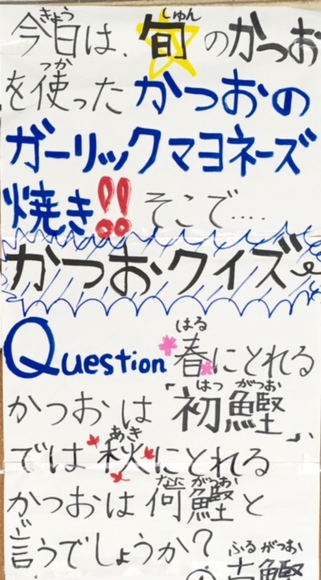 今日の献立は、カツオのガーリックマヨネーズ焼、グリーンアスパラガスのソテー、スープ、大型コッペパン、牛乳です。