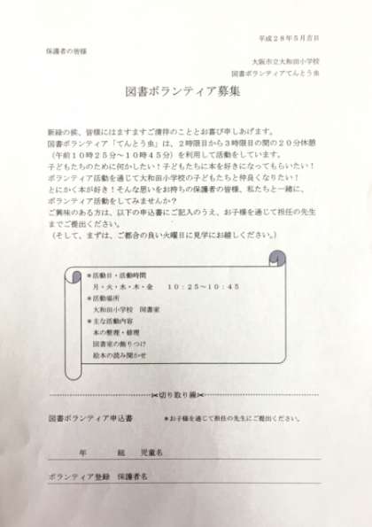 つきましては、新規に図書ボランティアを募集いたします。ぜひボランティアに参加してお力添えくださいますよう、お願い申し上げます。