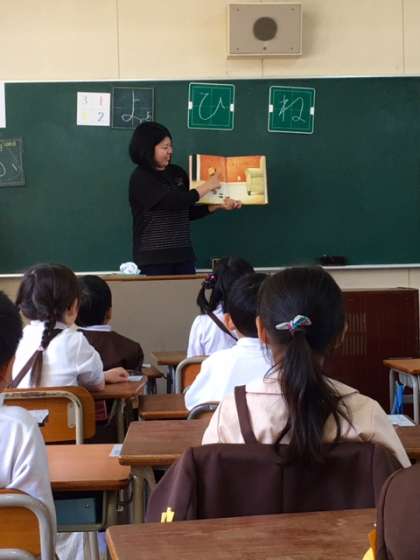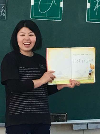 1年2組では、担任の守島先生が「だめよ、デビッド」の読み聞かせをしてくださっています。