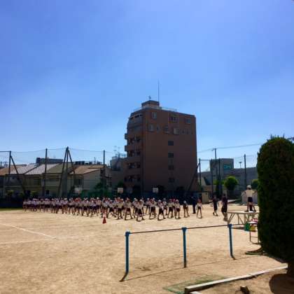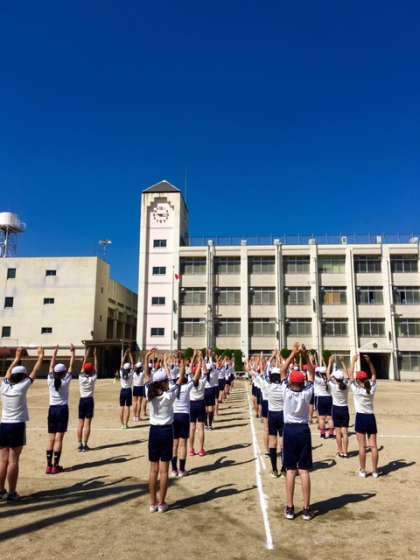 久しぶりの青空です。6年生の児童が、運動場に出て運動会の練習をしています。