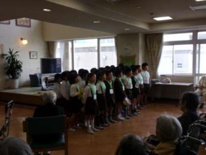 今日は、近くの特別養護老人ホームへ世代間交流に行きました。