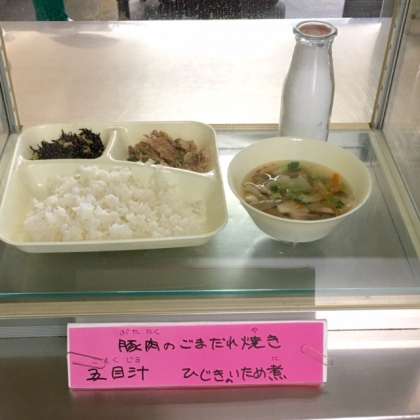 さて今日の献立は、豚肉の胡麻だれ焼、五目汁、ひじきの炒め煮、ごはん、牛乳です。