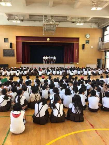 水曜日の朝は「なかよし集会」です。子どもたちは「たて割り班」で集まります。
