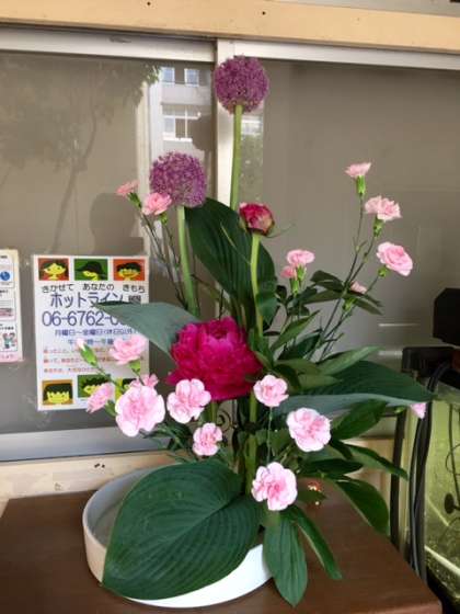 初夏にふさわしく、爽やかで優しい雰囲気の生花です。芍薬を中心にアリウム・ギガンテウムやスプレーカーネーションの紫色〜赤紫〜ピンク色のグラデーションが見事です。その花を縁取る緑色の大きな葉っぱがダイナミックですね。