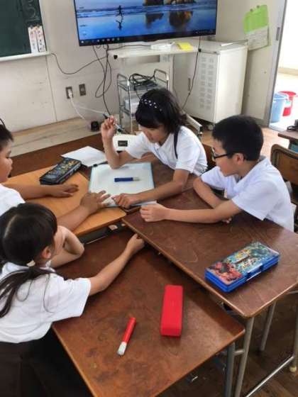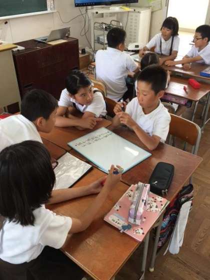 4年1組がホワイトボードを使って、学級活動をしています。グループで課題を解決する方法を見つけています。