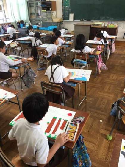 2年1組は、5時間目の水彩絵の具に続き、6時間目はパスで絵を描いています。