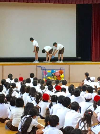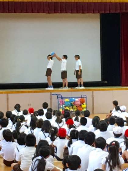 今日のゲームは「ボール送り」です。運営委員会の皆さんがゲームの方法を実演して説明してくれました。