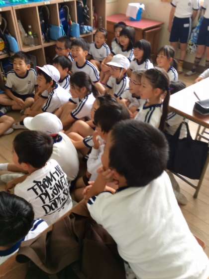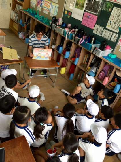 3年1組は、教務主任の三好先生が絵本を読んでくださっています。子どもたちは大喜びです。